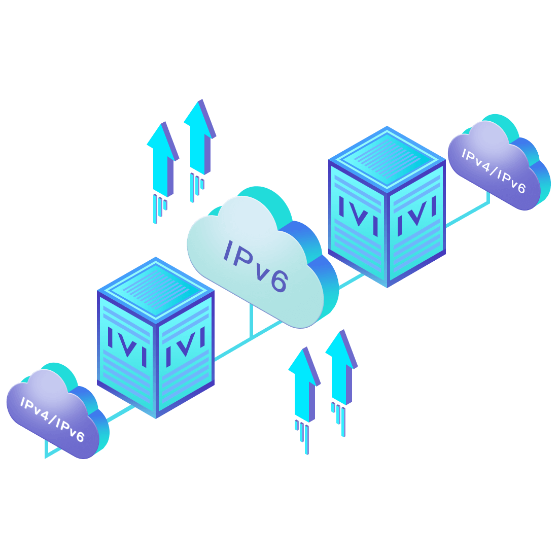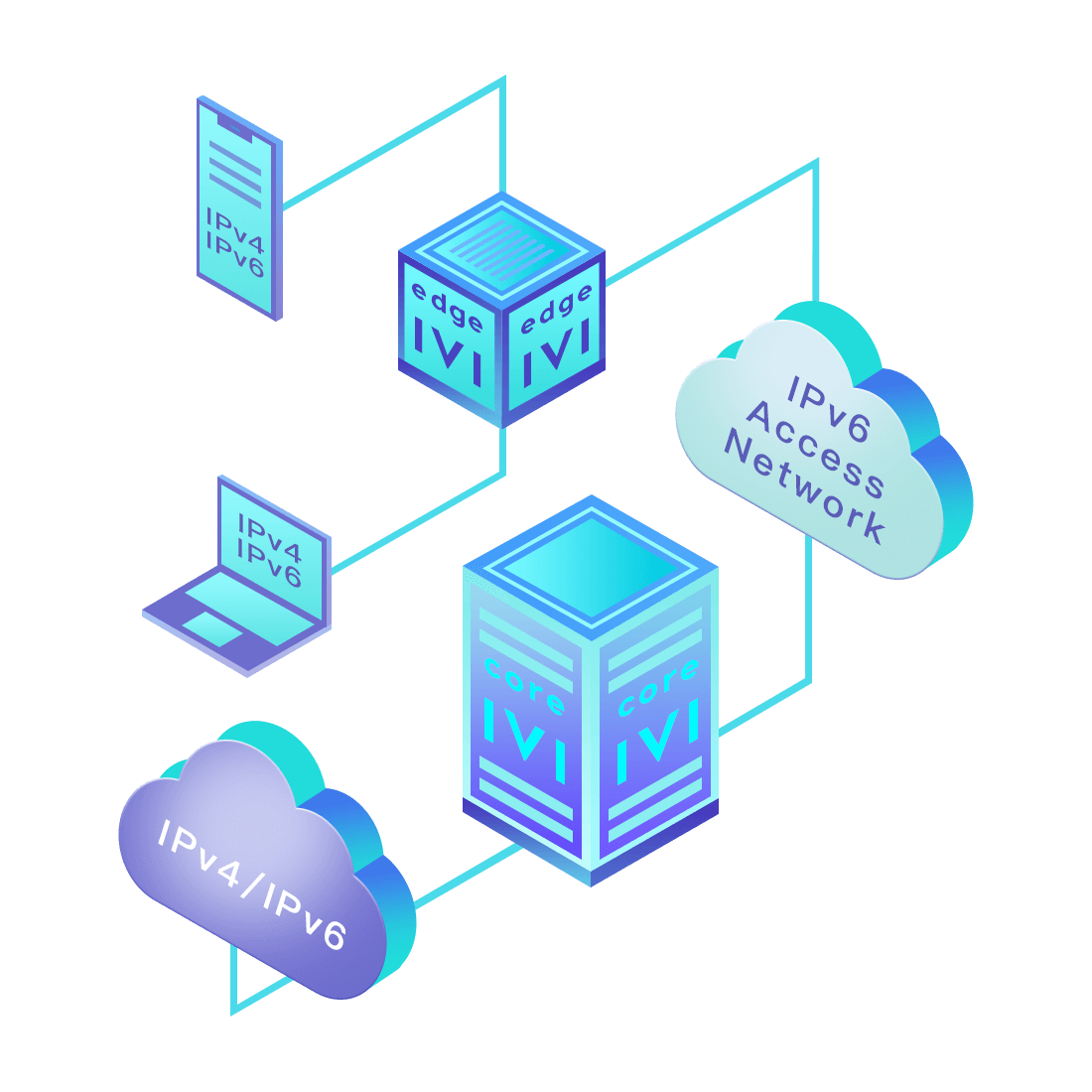 對(duì)正在進(jìn)行IPv6整體升級(jí)規(guī)劃的運(yùn)營(yíng)商,應(yīng)用IPv6升級(jí)方案2.5,通過(guò)IVI無(wú)狀態(tài)翻譯技術(shù)和純IPv6接入網(wǎng)絡(luò),為雙棧客戶(hù)端和雙棧服務(wù)器提供連通服務(wù)。